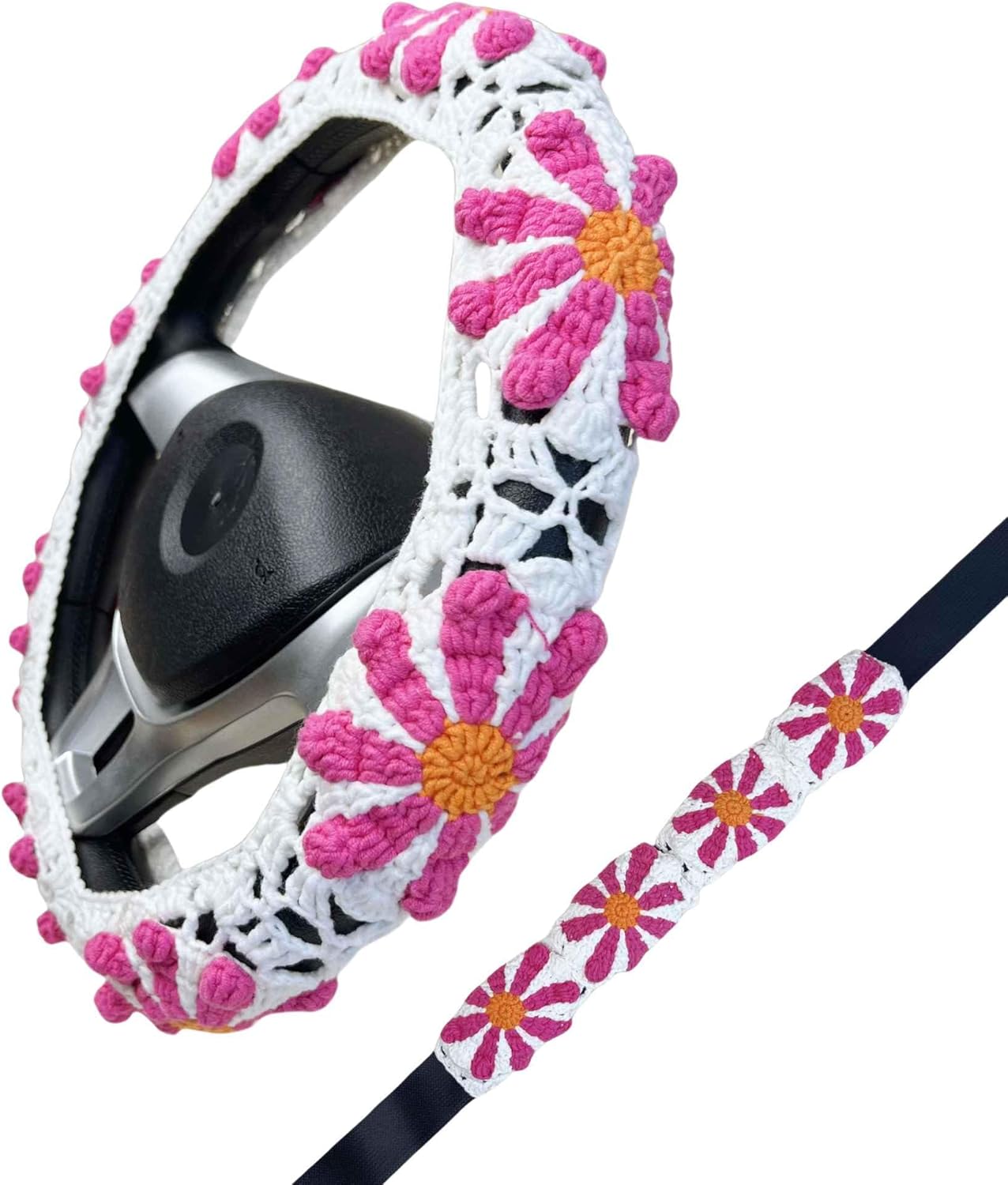 This handmade crochet steering wheel cover with a Sun and Moondesign brings both warmth and personality to your car interior. The set also includes two matching seat belt covers for extra comfort. Features: Universal fit: Suitable for most standard steering wheels with a diameter of 14 to 15 inches. The elastic crochet structure allows for an easy, snug installation. Non-slip design: In addition to the natural elasticity of crochet, each cover is fixed with needle and yarn stitching for added grip and safety. Soft and cozy: The thick yarn texture offers a comfortable and warm touch, making your driving experience more enjoyable. Seat belt covers included: The two seat belt covers fasten securely with buttons. They help prevent irritation from seat belts and are designed to fit most car models. Please double-check your seat belt size before purchasing. Customizable colors: If you prefer different color combinations, feel free to contact us. We are happy to customize your set. This crochet set also makes a thoughtful gift for occasions like Mother’s Day, Father’s Day, Christmas, or for any close friend who appreciates unique handmade items. If you have any questions or special requests, please do not hesitate to reach out. We are always here to help.