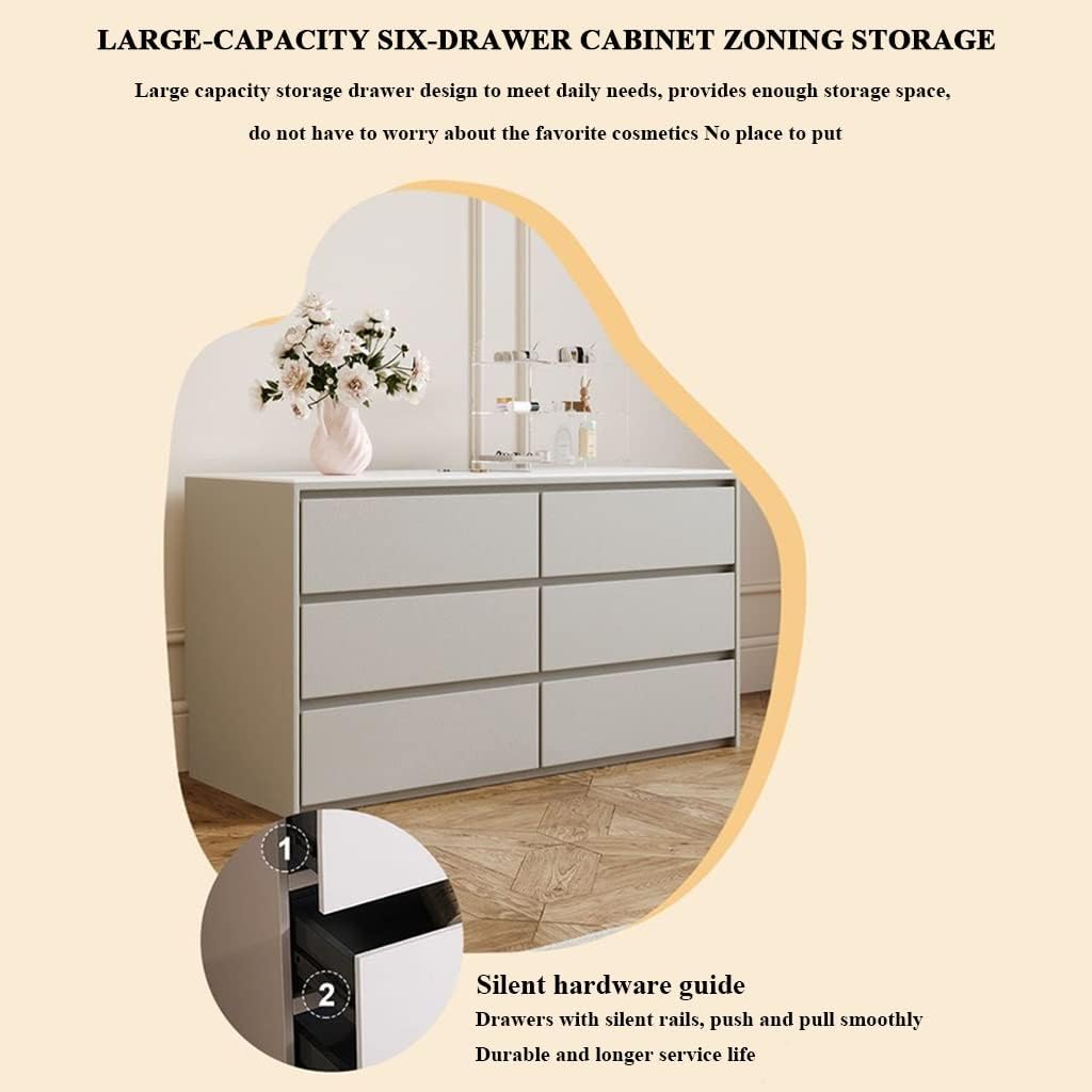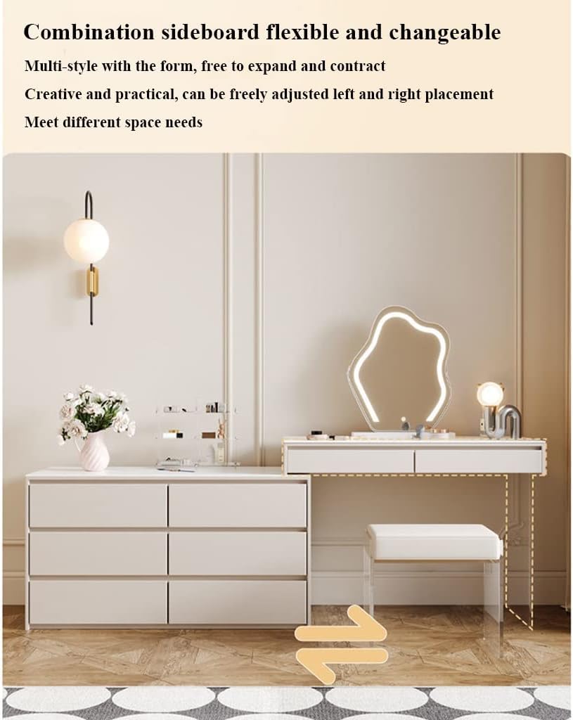 This vanity desk set creates your own space and helps you escape from the madness of what's happening in reality. Perfect vanity for your daily makeup and styling. Great gift for birth and anniversaries! Large-capacity drawer cabinet zoning storage Large capacity storage drawer design to meet the daily needs, providing enough storage space, do not worry about like cosmetics nowhere to put Silent hardware guide Drawers with silent guide, push and pull smooth and durable, longer service life Reserved 15cm skirting position Seamless wall design for miscellaneous items not to fall Retractable Desktop The desktop is highly expandable and can be freely moved left and right, expanding or reducing the usable area to meet your different needs. Name: Drawer Chest Material: Wood + rock board Applicable age group: adults Occasion: living room, bedroom, outdoor, dining room Size: 80cm , 100cm , 120cm 1 x Dressers Note: 1. Manual measurement has been used, there may be some reasonable error. 2. Due to factors such as display equipment and shooting environment, the color of the item may be slightly different from the picture, which is a normal phenomenon, please refer to the actual item.