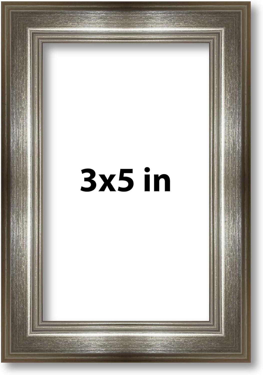 4x5 Antique Pewter Silver Finish Solid Wood Picture Frame - UV Acrylic, Foam Board Backing, & Hanging Hardware Included.. This Wood Picture Frame has been built for images measuring 4x5 Inches.. Overall dimensions 4.75x5.75 Inches.. Moulding Width: 0.75 Inches - Rabbet Depth: 3/8 Inches. UV Resistant Frame Grade Acrylic Sheet & Foam Board Backing Included.. Hanging hardware is included but not installed—easily attach for vertical or horizontal display. Easel Stand Included for Table Top Display.
