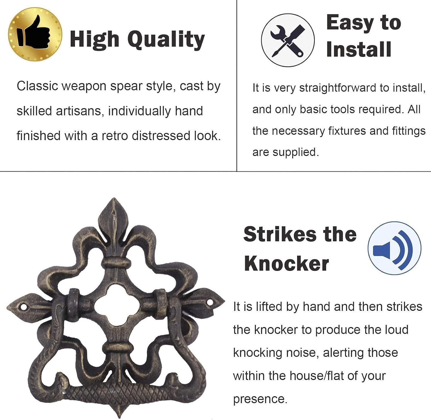 What's better than our powerful antique clapper with spear to welcome your guests Cast from the original molds,our authentic foundry cast iron is sure to impress with resonant knocks that make big statements on front doors. Features: - Sturdy vintage cast iron - Classic sculpture design,vintage,spear - Suitable for indoor / outdoor / townhouses / neighborhoods / cabinet / wardrobe / apartments / drawers / cabinet / other furniture use - American modern rustic design furniture - As a towel rail / open wardrobe or with open handle / hinges for doors and windows - Quick and easy assembly - Perfect for the small space where you needed to insert it,but large enough that you can easily loop it to grab and beat - and sturdy too Specifications - Material: cast iron - Color: Vintage color - Dimensions: 16.1 × 16.1 cm (6.34 × 6.34 inch) - Weight: 1 kg Package Contents : 1 x door knocker (decorative items shown in product photos are not included) Note: - There may be 1-3cm error due to the safety manual. - There may be chromatic aberration due to the difference between the recording lamp and the display.Please refer to the actual product. We have multiple styles of door knockers: front door knocker,door earrings,peephole knocker,bee knocker,lion knocker,brass knocker ,bat clapper,cat clapper,halloween clapper,black clapper,pineapple clapper,bumblebee clapper,skull clapper... If you need other styles of clapper,you can browse our store at will.